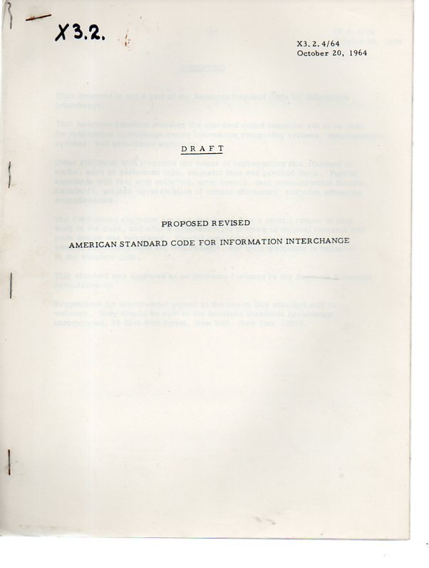 -- (uncredited) DRAFT, Proposed Revised American Standard Code for Information Interchange. X3.2.4/64 20 October 1964. 48pp. [The "4" part of X3.2.4 is the Code Development Task Group