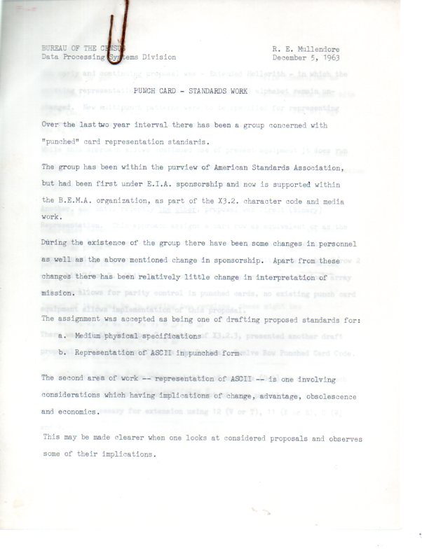 --______. Punch Card--Standards Work, Bureau of the U.S. Census, Data Processing Systems Division, 5 December 1963. (By Mullendore.) 3pp, offset printed (?)
