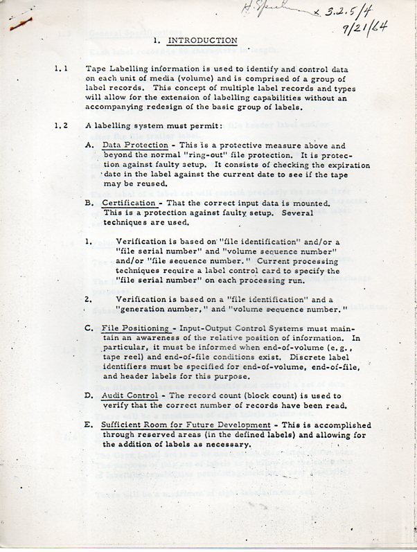 --Introduction. Tape Labeling Information... X3.2.5/4 21 September 1964. 10pp.