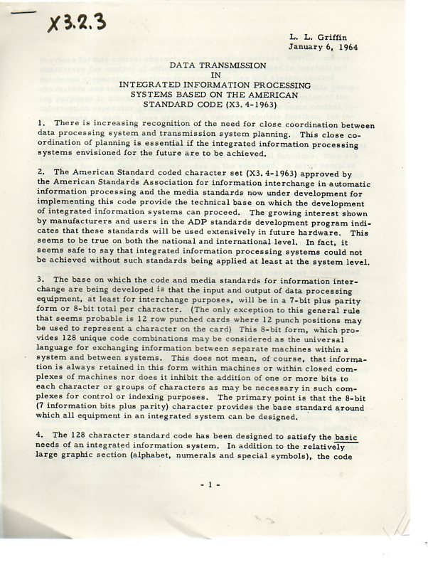 --Griffin, L.L. Data Transmission in Integrated Information PRocessing Systems Based on the American Standard Code, (X3.4-1963). 5pp