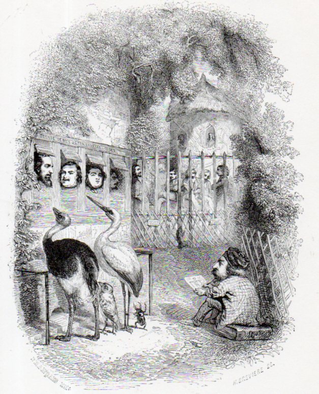 A zoo of intellect--animals inspect specimens in a human zoo, in this case featuring first the great gatherers of human capacity and imagination, the writers (from Les Animaux):
