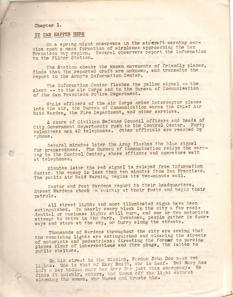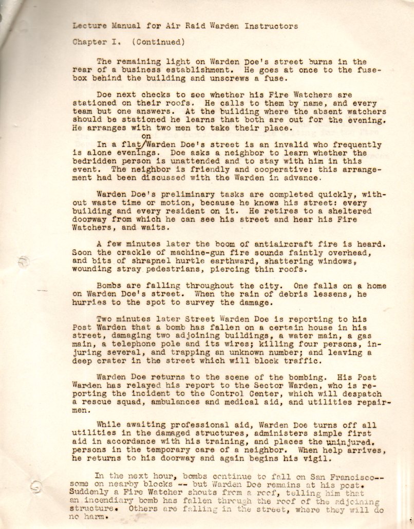 Lecture Manual for Air Raid Warden Instructors is in its way a remarkable document revealing some of the thinking and interpretation on the chances for the invasion of the American west coast just a few months (March 9, 1941) following Pearl Harbor. Undertaken and published by the Workers of the Writers' Program ('of the Works Projects Administration in Northern California") it was a product of one of the number of the Roosevelt administration's social engineering programs that had a long lasting effect.
