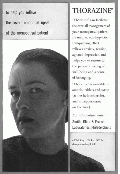 And back to the old standby, Thorazine, which was administered very liberally in institutional settings to turn the problematic and uncontrollable patient into a drooling, blank-eyed mess. In order to control women in menopause, it was Thorazine to the rescue: