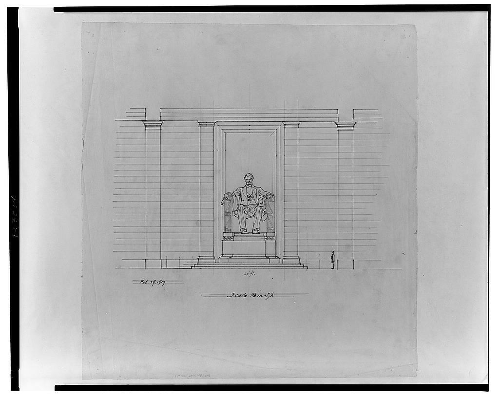 Henry Bacon (1866-1924) was the architect of the Lincoln Memorial--it was his last major assignment and I should say his greatest. I found in the Library of Congress some of the drawings he made (completed 1910-1917) envisioning the space, and they included what might very loosely be called pentimenti of the statue of Lincoln that was to be provided by Daniel Chester Smith (1850-1931). They are really just placeholders, models, of how the finished statue would occupy the space. When I saw these drawings I realized how perfectly the finished works lived together.