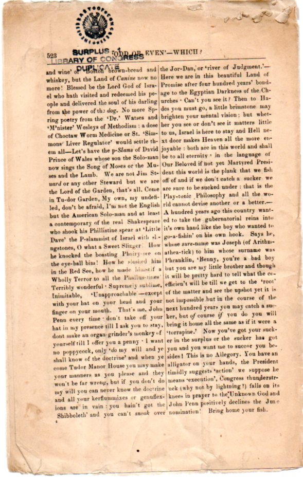 I can find nothing for Mr. Penn, who claims that this is Volume 3 Number 2 of a magazine called The Revelator (June 1888), a magazine that doesn't seem to exist in the holdings of the massive WorldCat/OCLC. The message of the slim and fragile pamphlet is--in the most kind appreciation possible--unclear. There seems to be a lot of political something going on, though it is a tangled webby road. Much of the center stage seems occupied by the election of 1888, when President Cleveland was renominated in a peaceful convention, but then bested by Republican challenger Ben Harrison in the electoral college in one of those elections where most stuff seemed to be going relatively fine in the United States. (Cleveland would come back to defeat Harrison in 1892.) So references to something like "Big Little Franklin" might actually refer to Benjamin Franklin Jones (1826-1903) who was the chair of the RNC from 1884-188 and the force behind the failed James Blaine nomination in '88. Some references are obscure but solid, and some are just obscure and unsolid, and others turn the deep corner of obscure and fly into the arms of mondo bizarro.