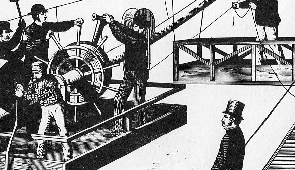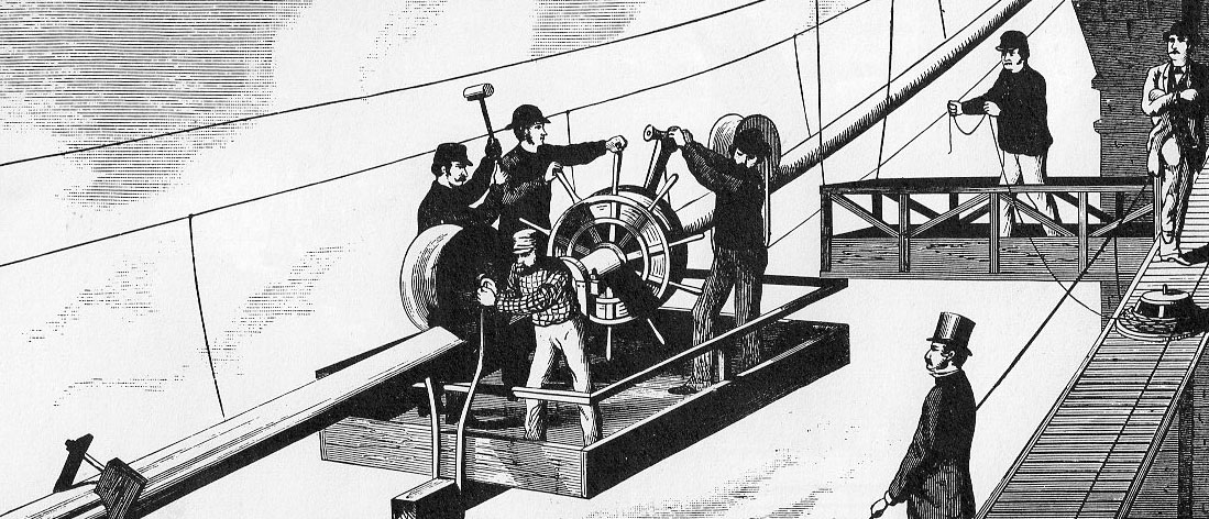of the half-completed* Brooklyn Bridge, showing master mechanic and chief engineer of the project E.F. (Frank) Farrington making his slidy way as the first person to cross between the two spans (on 26 August 1876).