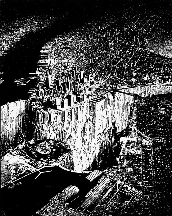 And along this line of thinking I include a very interesting drawing made by architect Lebbeus Woods, showing the bedrock part of Manhattan. He empties the East River and damns (?) the Hudson, and also builds some new port extending from Staten Island or out from Jersey...but the effect of the dry river bed between Manhattan and Brooklyn. Andthen some--he empties the river, and then deepens/excavates, heightening the depths (?!) of Manhattan Canyon. The depth of the river where we can see it in the drawing is maybe 100 feet, and certainly (judging the depth against the heights of the structures in the lower island) the canyon is deeper than that--maybe an order of magnitude deeper.