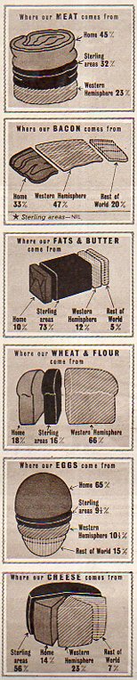 Understatement alrt: Great Britain suffered food and material shortages for years after the end of WWII, a difficult peacetime in victory. That said, this four month assortment of food looks to be pretty spare, especially for fruits and cheese.