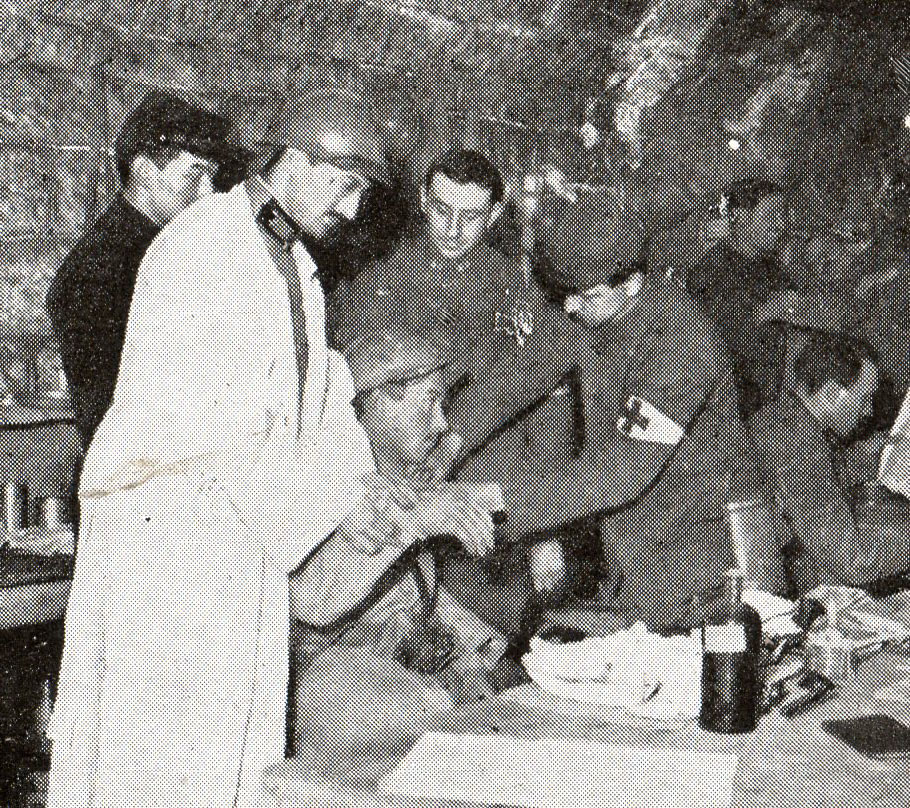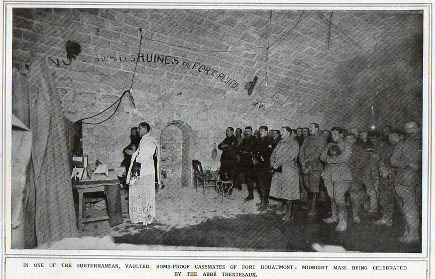 A bit of calm, or at least a bit of a place that could not be reached by shells or bullets, was found bellow ground in the cellars of Douaumont Fort, in Verdun. These images were made at the very end of 1916, and published in The Illustrated London News for 13 January 1917. These images show another side of that battle, of soldiers meeting for religious services and for medical attention in the cellars ("...the subterranean, vaulted, stone-built casements, deep underground beyond possibility of penetration by the heaviest bomb") of one of the barrier-forts surrounding Verdun, Douaumont.