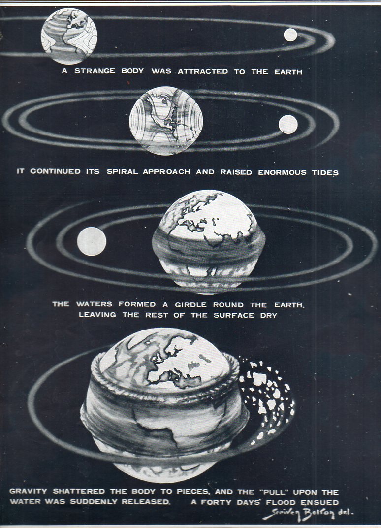This lovely if not very convincing argument was produced and directed by "a German engineer, Herr" (Enrst) Horgiger, of Munich. He attempted to wed belief and mythology and astronomy, providing a worlds-in-collision explanation for the Flood. From the caption to the drawing I do not know if it is The Flood of Noah, as it occurs in the book of Genesis in the Bible, or the flood of Apollodorus, or Hygenius, or of the Eridu Genesis (some 2000 years or so before Genesis) or the flood of Atrachasis (of about 1650 bce) or the flood of Gilgamesh (of about 1100 bce), or if it is the flood of Emhil, or Zeus, or Allah, or Yahweh, or the other 150+ great floods of mythology categorized by James Frazer in his astounding but unreadable books. But it is a flood, and his reason is that a wandering body in space came into temporary orbit around the Earth with a resulting gravitational soup that caused the waters to rise up after which the flood occurred and the orbiting sphere to break apart.