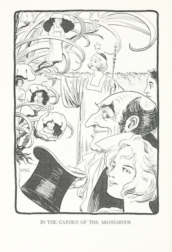 Another part of this adventure finds Dorothy in the Land of the Mangaboos, which is her initial contact with subterranean civilizations. The geography of this country seemed similar to the one on the surface of the Earth, except that everything kept changing color, the effect generated by the six different suns of six different colors. There was a central sun much like our own, though this had five other suns in (stationary?) orbit around it, all making for an interesting stellar astrophysics: one sun was rose, another violet, then yellow, blue and orange. They also were a fixed feature there underground, maintain the same position throughout time. There was a continuous day in the Land of the Mangabos, always bright and always light, and it seems that the inhabitants had no way of reckoning time. (Except that they did, as the Mangaboos were a race of vegetable people who grew on vines for many years, through their childhood and past their adolescence, waiting in silence and inaction until they had reached maturity, at which time they were plucked from the vine and entered a cognizant life. The problem though was that most of these people lived for only five years, the bulk of their lives spent in maturation limbo. So there was a method of keeping time--it just didn't depend on anything resembling a solar clock). The Mangaboos are described so: