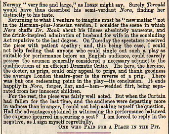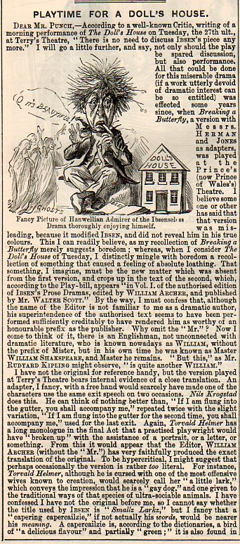 These bits just caught my eye, found in the 1891 volume of Punch magazine, a smart and sharp-as-broken-glass humorous/satirical/social commentary popular English mag. It takes Henrik Ibsen to a rough task: evidently, if Ibsen were a color-by-number portrait to be painted, Punch would give him the numbers "1" and "2", and then color everything in one color. Somestimes something can be revolutionary and essential and unlikable, even when it has become the modern world's most-often-performed play.