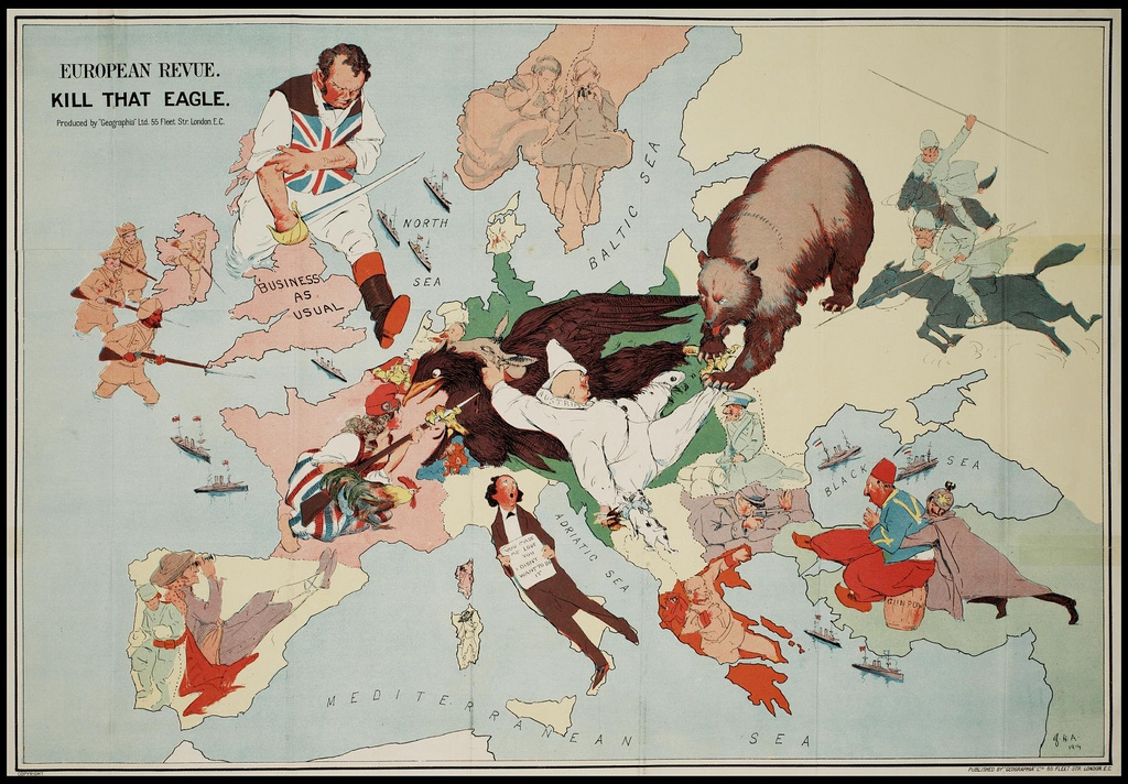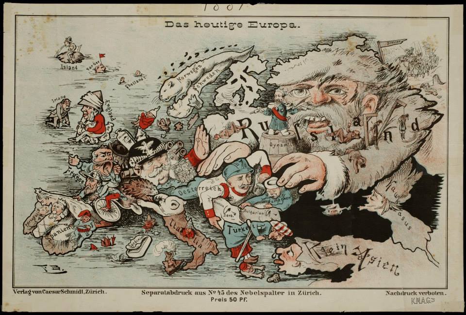 I've collected a dozen maps here showing an animorphization of battlefield Europa over a period of about 40 years, from the Franco-Prussian War to the beginning of WWI. They are biting and vicious, and no one seem to receive this bitter sword more savagely than the Russians. The maps basically need no commentary, so I won't contribute any. (Thanks to Mark Dylan Sieber's Les Curiosites de Cartes, whose Twitter feed started this interest.)