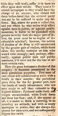 This is really very good: on distinguishing the free press with what it is and what it isn't. The art icle appeared a few months before the official declaration of war between the U.S. and the U.K. (June 1812) in Cobbett's Weekly Political Register. It was written by William Cobbett (1763-1835) and I think that this was a direct and very vocal reaction to the government's instituting a tax on newspapers such as this--adding a tax made the journal not affordable to but a select class, thereby limiting circulation and being a de facto censor for the distribution of information.