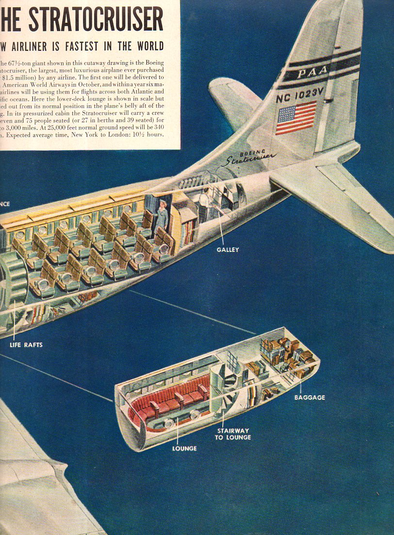 Beginning to unpack from our move, the very first thing to emerge from the very first ("desk") box out in the studio was a clutch of cut-away aviation images. And the first of those was this beautiful 1948 two-parter from LIFE magazine of the new PanAm B-377 Stratocruiser. The Stratocruiser was first flown in 1947 and was a derivative of the B-29 (troop transport) Superfortress via the C-97 Stratofreighter. Aside from the general opulence, the dark-blue background of this image is just lovely.