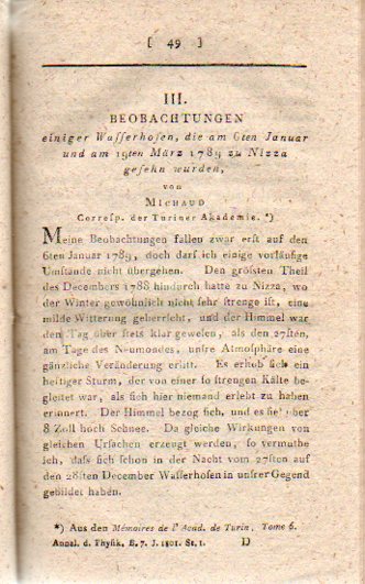 The first installation comes from series 1 volume 7, 1801, from an article about the work of Michaud on waterspouts, "Beobachtungen einiger Wasserhosen...". (The subject of waterspouts is an old one in scientific literature, most notably appearing in the scientific journal world in the Philosophical Transactions and reaching back to at least 1695, and Michaud's work on the subject extends to at least 1788. The use of waterspouts and tornadoes in art and in scientific literature in general is much older, with printed depictions of these creatures stretching back to the early 16th century. See this lovely and very useful site for a chronological display of tornadoes and waterspouts.)