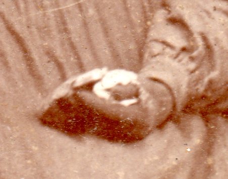 Certainly there is some sort of recognition of being vigilant, of bearing witness, of some sort of fidelity, but of what sort? The second, standing man is clearly showing respect and directing the viewer's attention to the hand-holding of the seated couple. Is this a mother and son, long reunited, after years apart? Or is this a married/marrying pair, age difference be damned? In whatever case, it is the standing man and observer who seems to exhibit any sort of emotion besides dread or confusion.