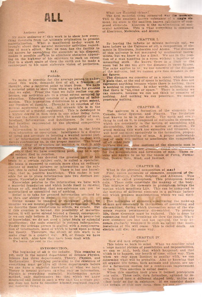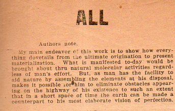 Aside from its unusual composition and design, the work is an unwieldy but semi-non-poetic Aristotelian pronouncement on the constitution of man and the cosmos, and pretty mysterious. Well, "Aristotelian" goes a bit to far, but in a way it is accurate, because the author considers the essence of matter and being and time and space and is an observer of his world, and seems for himself anyway to have drawn a conclusion from it all, though it is difficult for me to say exactly what that is. Since the document is only a folded piece of paper, and the cover and back-page ad covers half of it, I've reproduced the two pages of print below.