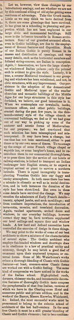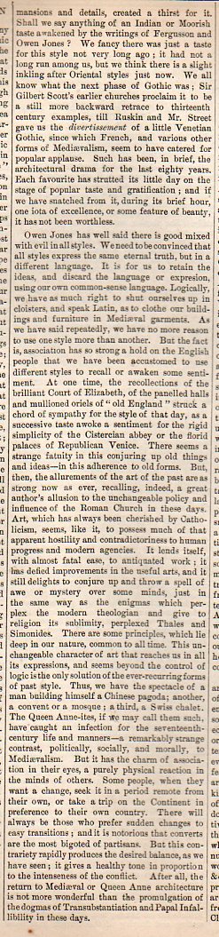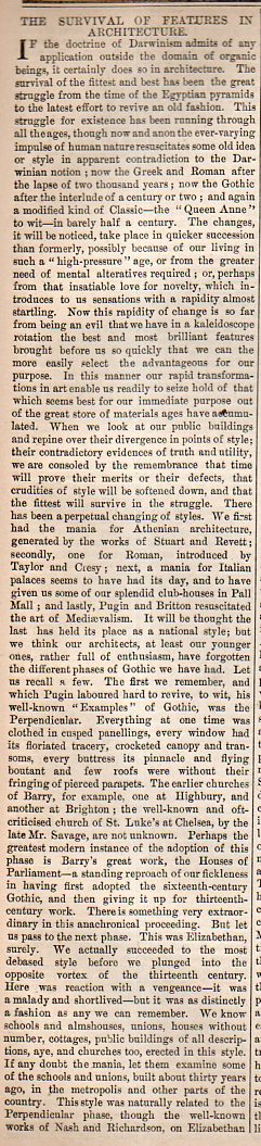 This is a curious pair of articles, both of which appeared 13 and 16 years after the publication of Darwin's On the Origin of Species.. (1859). The "survival of the fittest" used in conjunction with good and bad architecture is somewhat loosely affiliated with Darwin though it employs a term that was actually coined by Herbert Spencer in his book on Darwin and evolution that was published in 1864. (Here it is: "This survival of the fittest, which I have here sought to express in mechanical terms, is that which Mr. Darwin has called 'natural selection', or the preservation of favoured races in the struggle for life."-Herbert Spencer, Principles of Biology of 1864, volume 1, page 444.) It is an interesting idea that employing the ideas of evolution to areas of study like art and architecture, and not without some merit.
