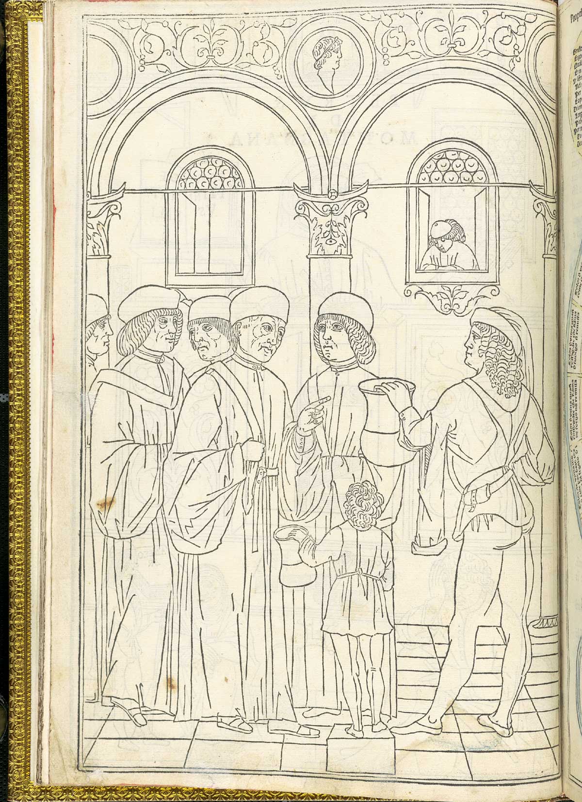 Its interesting to make a quick note on the books on display on the bookshelf behind the seated figure of Petrus de Montagnan (who is consulting classic texts in medicine as his three patients awaits his attention): the books include Aristotle, Hippocrates ("ippocrate"), Galieno (Galen), Avicenna (980-1037), Rasis (Ibn Sina, Rasis, Razi, Al-Razi, c.865-925), Mesue, Yuhanna bin Masawayh (c.777-857), and Averroes (1126-98), Abu el-Walid ibn Ruchd, Abu el-Walid ibn Ruchd. On the shelf to the right we see a copy of Naturalis Historia by Cais de Plnii (Gaius Plinius Seocndus, also known as Pliny the Elder, who lived from 23-79 A.C.E and who held forth on all knowledge from everywhere during the first century).