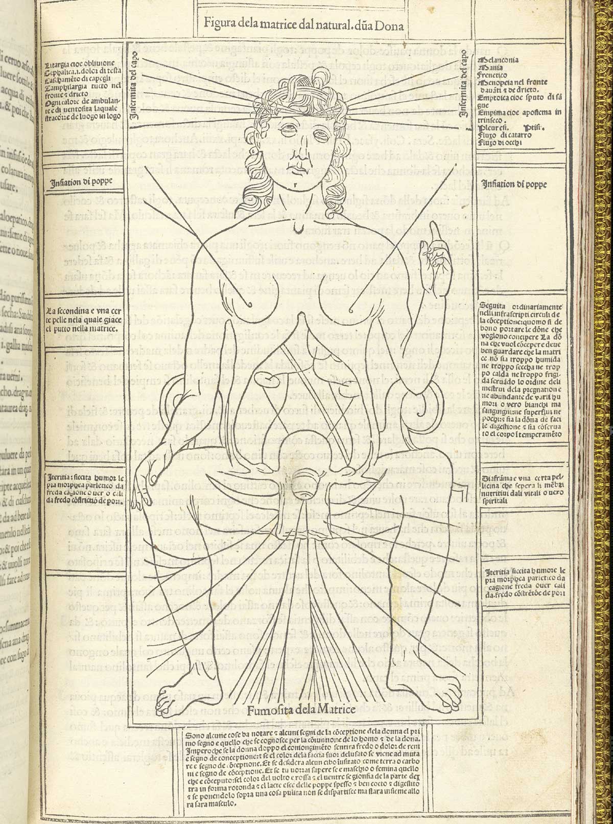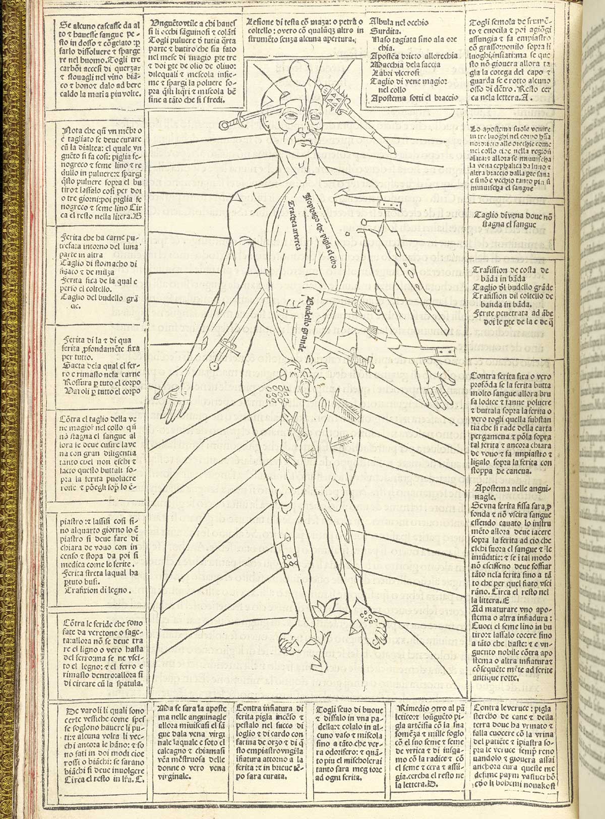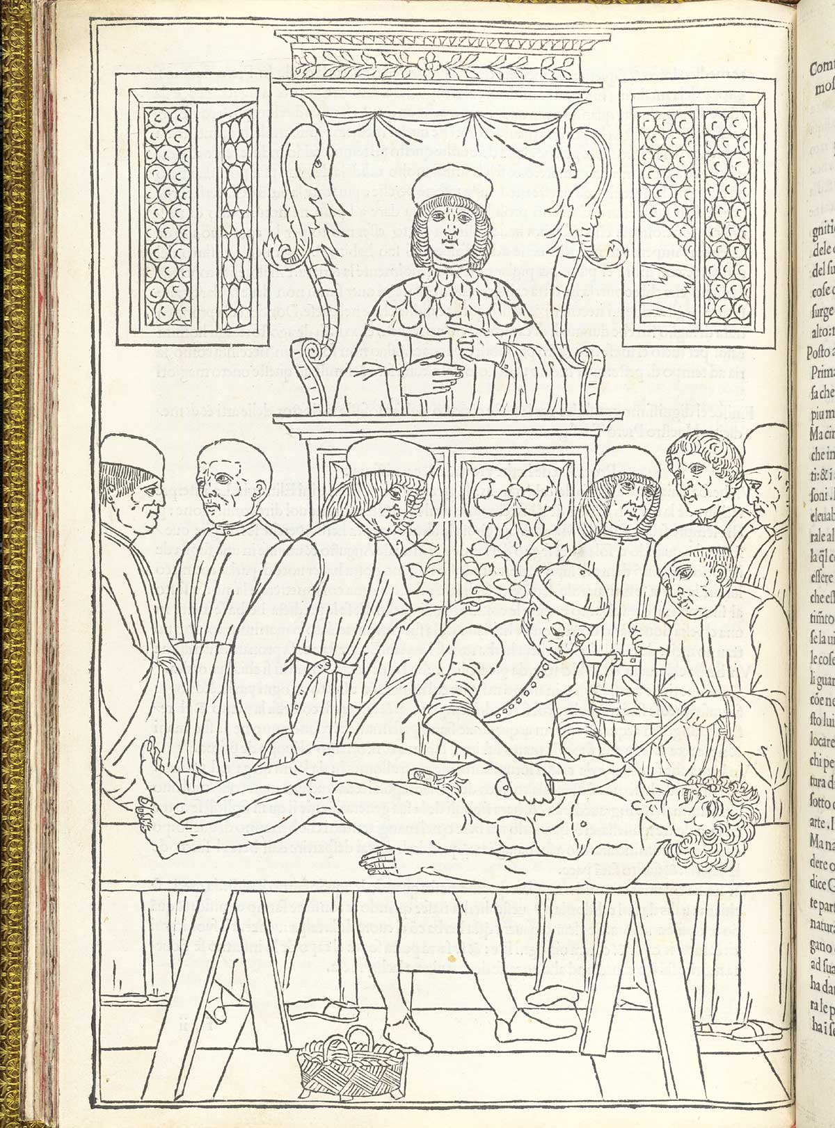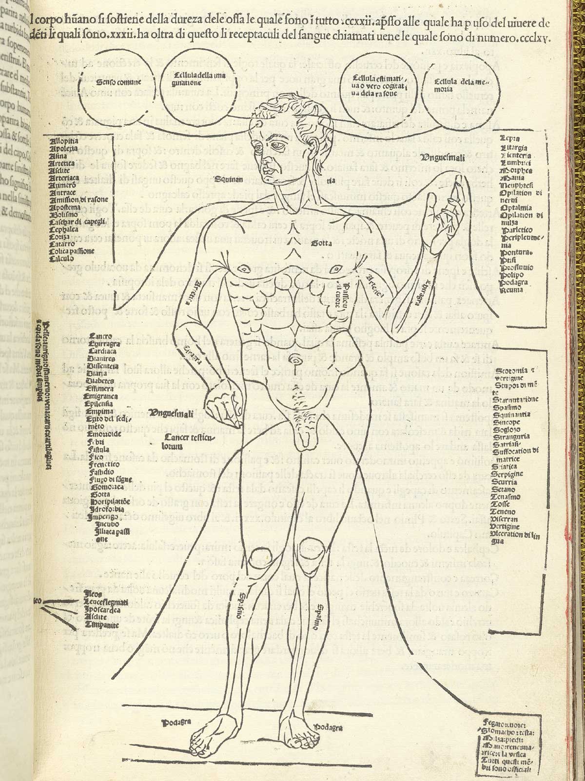 Johannes de Kehtam's Fasciculus Medicine (printed in Venice in 1500) was the first anatomy to be printed with illustrations. Ketham was described as a German doctor living in Italy and may well have been Johann von Kerchheim, a German practicing surgery and medicine in Venice during he 1470'), and who wrote a series of tracts on various aspects of medicine which were then collected into this single bound volume. The illustrations are spectacular and to me have a very modern sensibility in their mid-Renaissance woodcut legacy--the look very clear and concise, are well proportioned, nicely labeled, and give plenty of free rein to open and blank spaces on the woodblock. The only time these images really "fail" is when they appear in color--a process that would've been undertaken privately, by the purchaser of the book, who would have contracted with an artisan to color the book. The images in almost all of the cases of coloring that I have seen just do not match the elegance and brilliance of the original with no color.