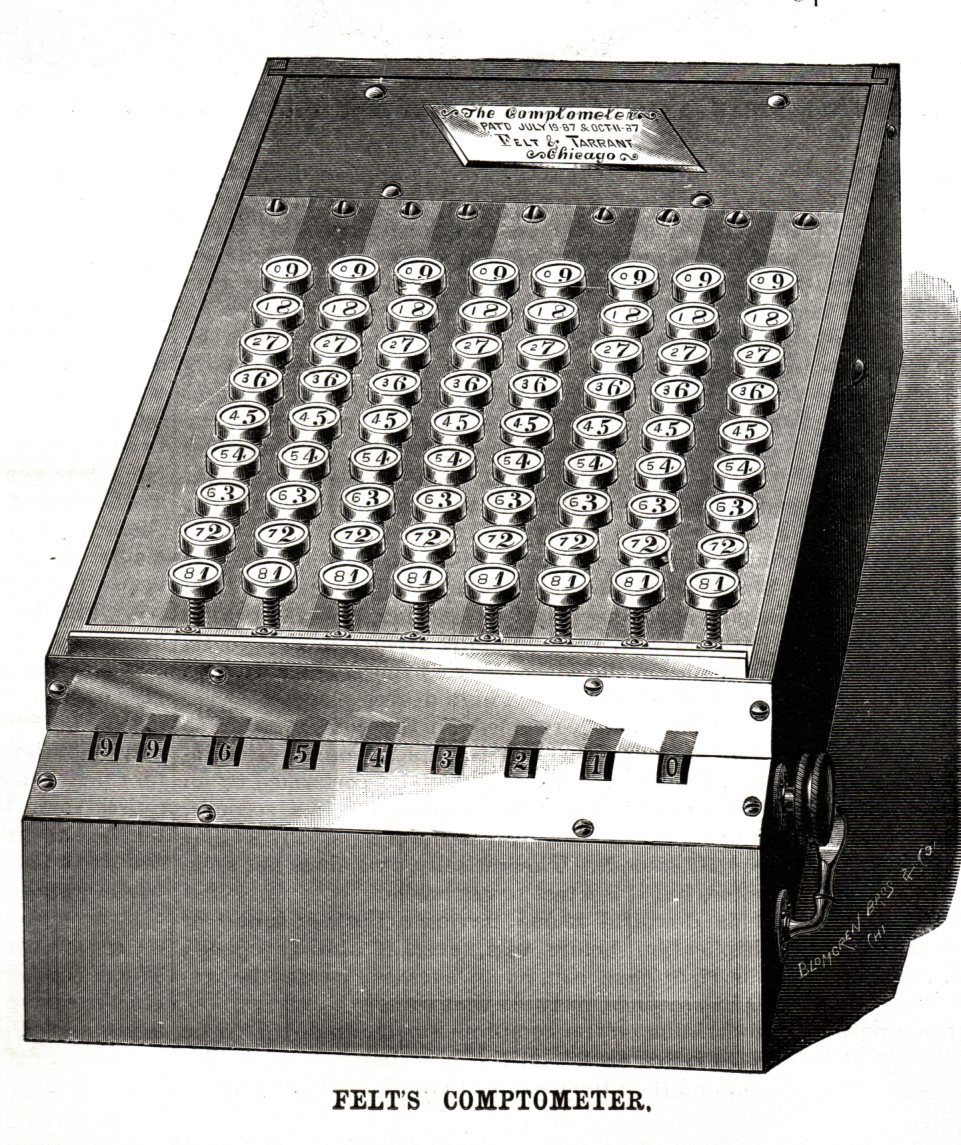 This magnificent image was--is--The Comptometer, a key-driven calculating machine made by Felt & Tarrant Manufacturing Company, a glorious instrument, encased in coppery metal, and just larger than a large shoebox. It was invented by Dorr E. Felt (1862-1930) in 1889, and in order to put his idea into production went into business with the Chicago businessman and entrepreneur Robert Tarrant, and the two made an enormously successful go of the whole operation, the machine being easy to carry, and easy to use, and saved a huge amount of time in calculating mounds of long figures.