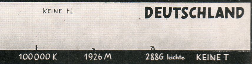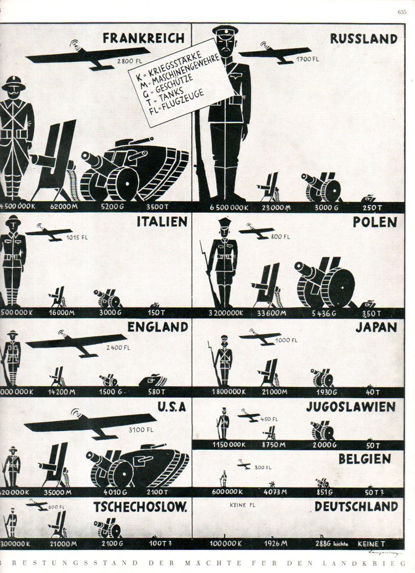 This is for issue #4523, August, 1929 of the Illustrirte Zeitung (Leipzig), "Der Rustungsstand der Machte fur den Landkrieg", which showed the comparative strengths of leading nations against that of Germany. As seen in the detail, in 1929 Germany was still abiding by the Treaty of Versailles, which was the peace treaty ending WWI and signed in 1919. The 440-clause treaty spent the first two dozen or so clauses discussing the creation of President Wilson's League of Nations, while the rest was a distribution of punishment and reparations against/on Germany. The German military as directed by Versailles was limited to 100,000 soldiers, and had 1926 machine guns, and 2886 cannons. as stipulated Germany could have no tanks and no air force, and was limited to six ships and no subs, and had to keep the Rhineland free of all armed forces. This would all be completely changed by 1934, when the Nazis were already well on the way to having a competitive (and modern) fighting force which counted 4.5 million troops. It would only get worse.