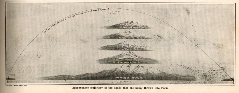 The story of the (very) long-range bombardment of Paris from points unknown is filled with questions in this article that appeared in the Scientific American on April 6, 1918. The writer hadn't an idea of the type of gun being used, the weight of the shell (yet), and just about all other details. The author did wonder about the reasons for such a gun--that the idea of a long-range indescrimient bombing from a great distance just seemed to be beyond the wanting capacity of the countries fighting Germany.