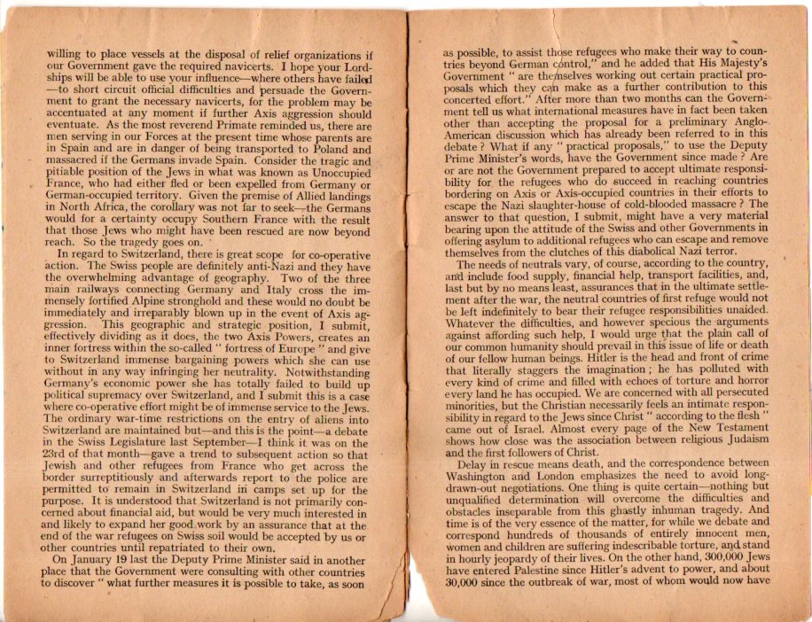 It is a very contentious issue as to whether the Allies could have taken pro-active measures against the concentration camps, and the issue of the discussion of whether help could have been given is contentious in itself. What makes this pamphlet noteworthy is that it showed there was a public display of concern during a time when there wasn't much public thinking being done on that. This is a complex issue, though I think the capacity to effect some sort of rescue of thousands, or hundreds of thousands (or millions) of people could have taken place2, though it did not, for reasons of indifference more so than for ability or capacity.