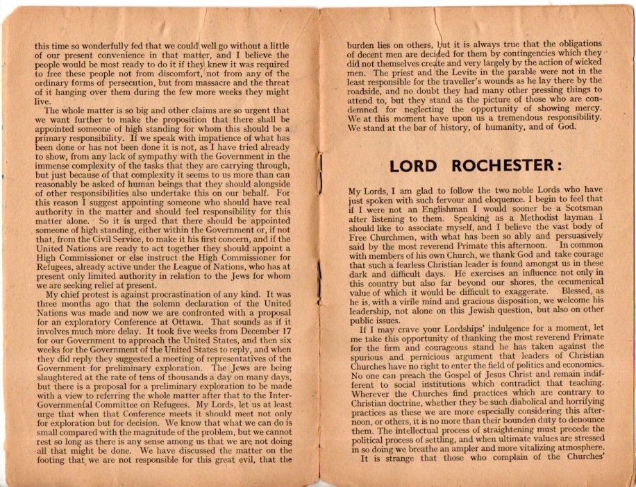 "My chief protest is against procrastination of any kind. ... The Jews are being slaughtered at the rate of tens of thousands a day on many days. ... It is always true that the obligations of decent men are decided for them by contingencies which they did not themselves create and very largely by the action of wicked men. The priest and the Levite in the parable were not in the least responsible for the traveller's wounds as he lay there by the roadside and no doubt they had many other pressing things to attend to, but they stand as the picture of those who are condemned for neglecting the opportunity of showing mercy. We at this moment have upon us a tremendous responsibility. We stand at the bar of history, of humanity and of God."