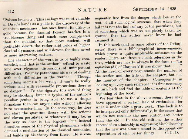 On rare occasions I would have all four editions (the first of 1930 is very scarce and valuable nowadays) but usually there would be editions 2, 3, and 4. In order to respond intelligently to the differences between the editions I went to the library and photocopied reviews of each (this in the pre-intertubeweb days). Today I managed to bump into the most interesting of the reviews (for the second edition of 1935 and published in the September 14, 1935 issue of Nature) which I reproduce below.