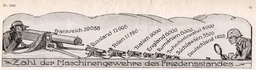 By 1928 Germany was certainly having multiple regressive thoughts about the Treaty, and public demonstrations of questioning its efficacy began to appear with more frequency. In this example--from the Illustrite Zeitung (Leipzig)--a strong statement was graphically displayed showing the state of the German military situation. As you can see, there is scant measurement for just about anything in the military sphere for Germany--and to press the matter home ever more so, in addition to the nulls and tiny numbers, there (in the sixth section down, and magnified above) is a helmeted German soldier with a large magnifying glass inspecting the German totals of the nearly-invisible machine gun totals.