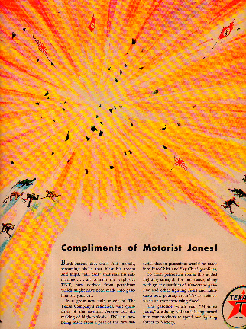 The Texaco Company was not kidding around when they expressed appreciation for their customers who still bought their product when available after rationing restrictions--they addressed their customers and showed them the result of channeling their rationed petroleum into the production of TNT. The graphic is the result of Texaco applying themselves to the war effort, and they did not want their current and future customers to forget it.