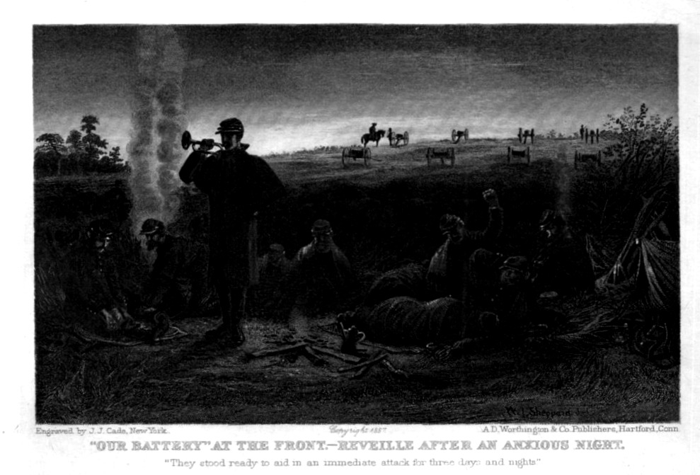 I found this engraving today in a small stack of Civil War images, and was taken by the small figures that lived inside it, particularly those standing behind the bugler. They were being called after a night without sleep, or fitful sleep; perhaps they endured a barrage themselves that night, or expected one; or perhaps they will engage in the morning. Whatever happened overnight was done, and the Sun was breaking over the long rising hill in the background, illuminating four canons and their artillery trucks, the several soldiers attending them (with one on horseback).