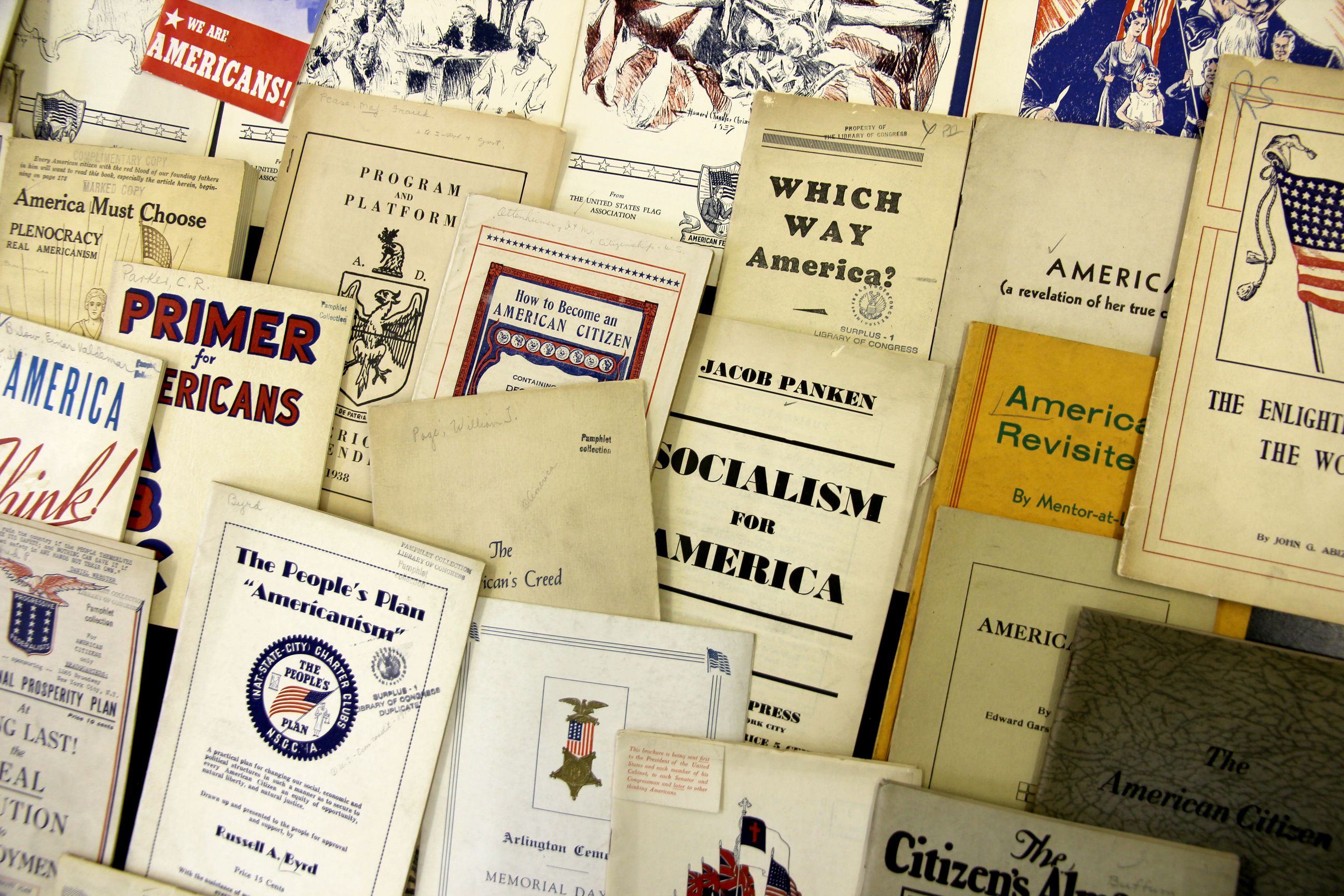 I've written a number of times on this blog on the now-unusual covers and titles and contents (sometimes all three combined) culled from a 90,000-item pamphlet collection. This afternoon I came across a small collection of U.S.A. patriotic (and otherwise) covers, published 1895-1945, most of which have a flag or other patriotic emblems on them. Some of the 125+ so works are simply patriotic works, some are flag-emblazoned works on economics, some are anti-Commie, some are isolationist, and some are, well, a little meshuga--what they all have in common is that they either have a flag or the (declarative!) words American/American on the cover. There's more to this collection, but this will do for now--I think these would be very interesting, and attractive, displayed properly, and they'd have more than a design-related story to tell.