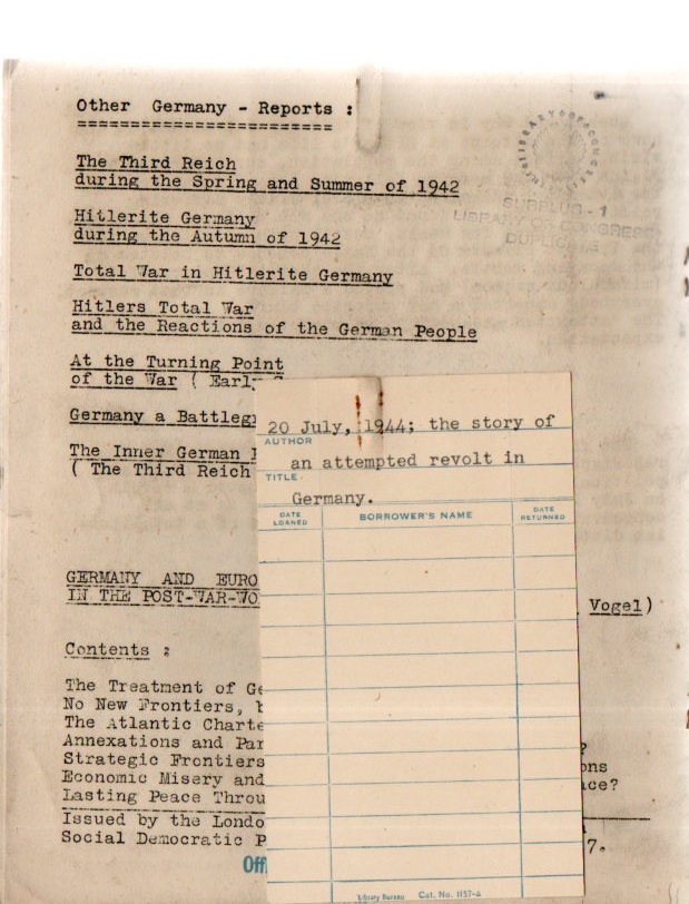 This pamphlet is scarcely-held in libraries--it is in the collections of the London Metropolitan Library, the Bibliothek der Friedrich-Ebert Stitftung, Deutsche National Bibliothek, and perhaps (though this is unclear) in the Library of Congress and perhaps at the Hoover Collection at Stanford. These two copies (in English and German) were previously in the library of the OSS (the precursor to the CIA) and then in the Library of Congress Pamphlet Collection, until coming here.