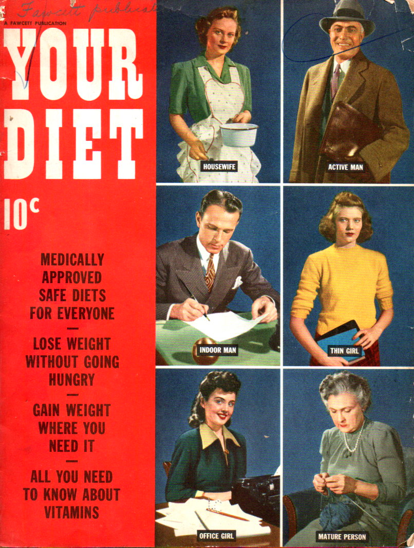 There is an indeterminate quality of quiet malice in these pictures, somehow--they seem bland and also threatening in some way. Perhaps it is the assumption of these Human Types that is so off-putting, with this 1939 pamphlet happy to categorize people into three major "types". "Active Man" seems like an aspiring non-perspirer, eager to let someone else do it; "Thin Girl" seems to be daring her simple classification; the "Housewife" needs to prove her name is accurate not only with the apron, but with a pot as well; "Mature Person" is urgently directing attention to high-attentioned-bits while maintaining a stiff unwrinkled nature; and "Office Girl" is stiff-backed with a pencil knife at ready. The whole cover for this diet regimen just seems softly-defined creepy--perhaps not so much for the titles, or the postures, but for the aggressive contrasting color.
