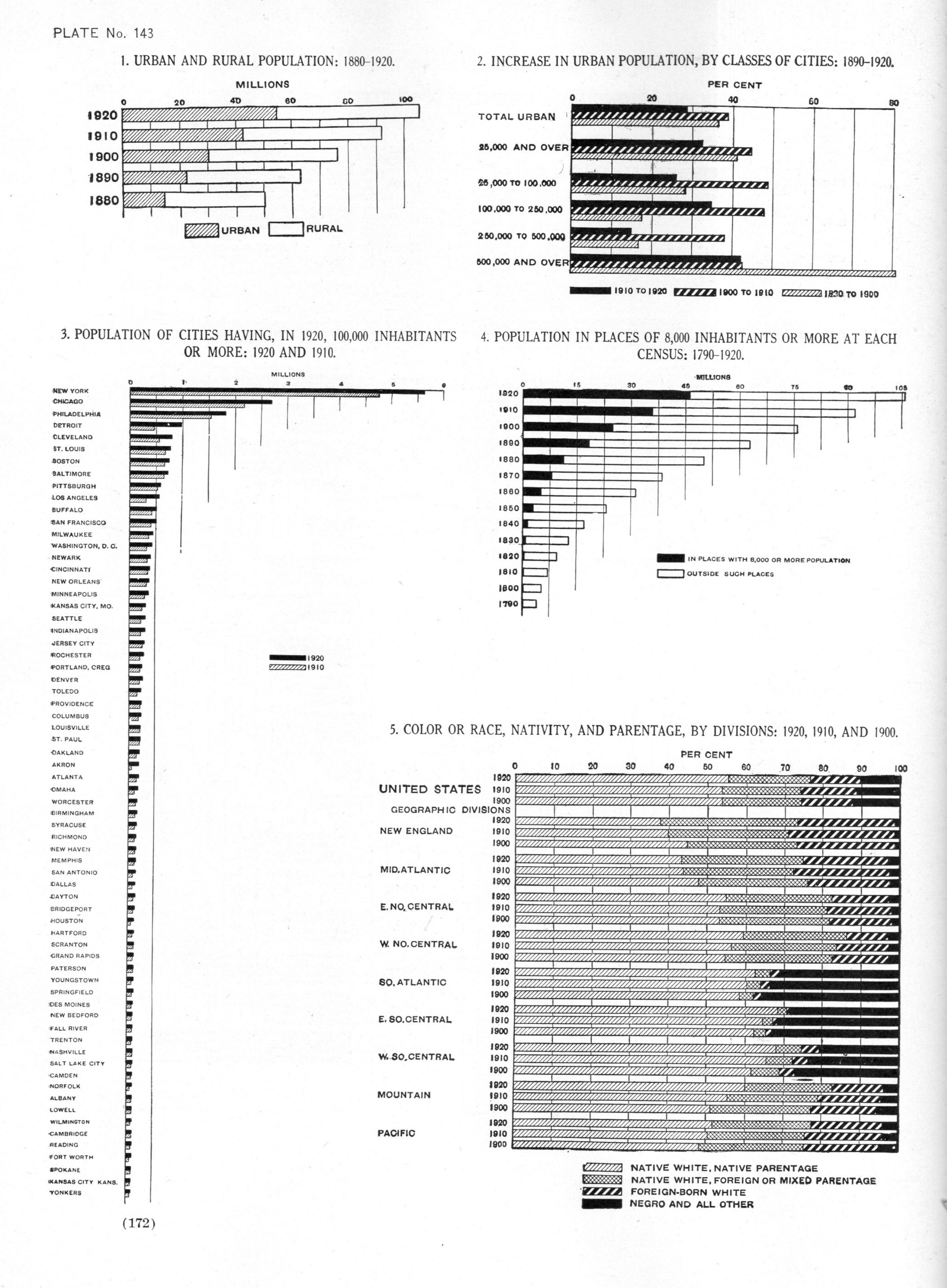 This fine, odd, and aggressively progressive-towards-skinniness of a graph appeared on plate 143 (page 173) in the great series of data visualization classics, the Statistical Atlas of the United States, published in Washington D.C., 1924. It is one of the simplest maps showing the development of the populations (compared to these extraordinary and classic attempts, here), and it is interesting to see where cities stood in 1920 relative to where they are today. For example, Detroit comes up at fourth in 1920, Cleveland 5th, Pittsburgh 8th, Buffalo 10th, Milwaukee 12, Newark 14th, Cincinnati 15th--of these, only Detroit (#19) and Milwaukee (#28) break the top-thirty in the census for 2010.
