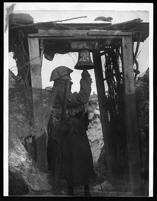 Infantryman with very primitive gas protection on guard with a bell, ready to signal the rest of the troops in event of a gas attack: