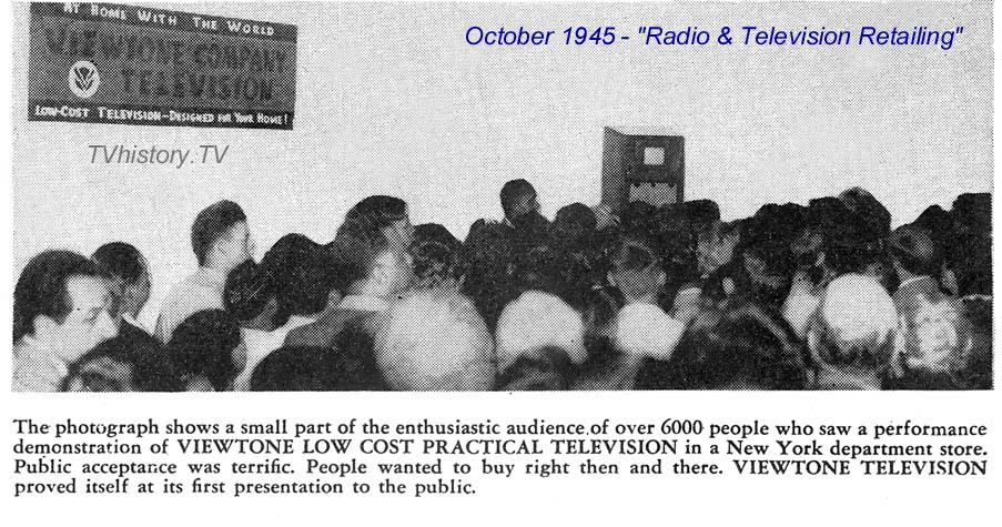 As much into the future as this demonstration and photograph looked, the Viewtone Company would not be a part of it. They were offering their TV at a very substantial reduction than would normally be expected in 1945, which perhaps lead to the company disappearing by mid-1947, just before the massive explosion in television ownership.