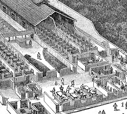"Thus washed and fed the beneficiary betakes to one of the dormitories 9 where he lies down upon one of the beds arranged in rows of twenty five in large structures heated in winter and aerated in summer. He finds here an iron bedstead provided with a mattress a bolster sheets and a blanket which are kept in a perfect state of cleanliness. The springs of these beds are of a new and interesting arrangement. They are formed of a metallic frame in which is stretched a thick cord rolled several times and forming a sort of lattice work. The elasticity of the system is excellent its cleanliness easily assured and its net cost extremely low. If we add to these various structures the lodge of the keepers 12 the lodge of the superintendent of the water closets 10 which have to be carefully looked after and the storerooms we shall have traversed all the parts of this establishment which are kept perfectly clean and are very carefully managed and are combined with a view to utility rather than to architectural beauty which would be much out of place for here every resource must be employed for rendering the greatest assistance possible to the victims of fate and its net cost extremely low."