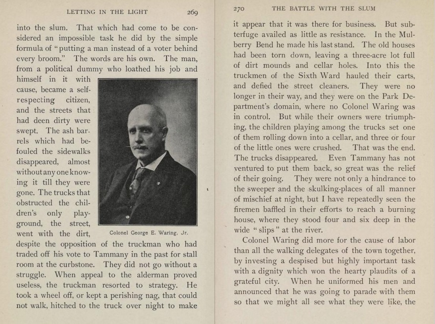 This story is told in the six pages (located below) from the great social observational/photo-documentarian Jacob Riis' The Battle with the Slum (1902) describing Col. Waring's efforts to clean the streets of Lower Manhattan. Riis is vicious with his treatment of the Tammany political machine for not undertaking any real effort to reduce the amount of street waste/filth, and heaped much praise on Waring, who he declared as the first to open the slums up to the light. That is just about right, and probably understates the case somewhat, as he was responsible through these efforts in saving the lives of thousands of people and improving the living condition for most of the city, in general.