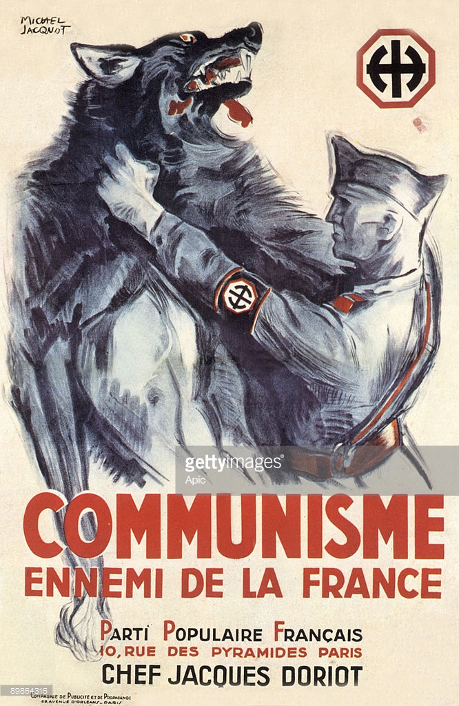 Jacquot also cooked this one up, a grim anti-Communist poster in support of the extreme Nationalist/National Socialist Parti Populaire Francais (the PPF) in 1943. The leader of the PPF was a former outted Communist named Jacues Doriot (1898-1945) who was a National Socialist, a Nazi supporter, a collaborator, a traitor to his country who broadcast for the Nazis on Radio Paris, and a person who co-founded the Legion des Volontaires Francaise (LVF), which was a unit of French soldiers who fought with the Wehrmacht. There are some other posters, too, including some vile anti-Semitic ones, but you get a good-enough taste for where Jacquot was headed during the 1935-1945 period.