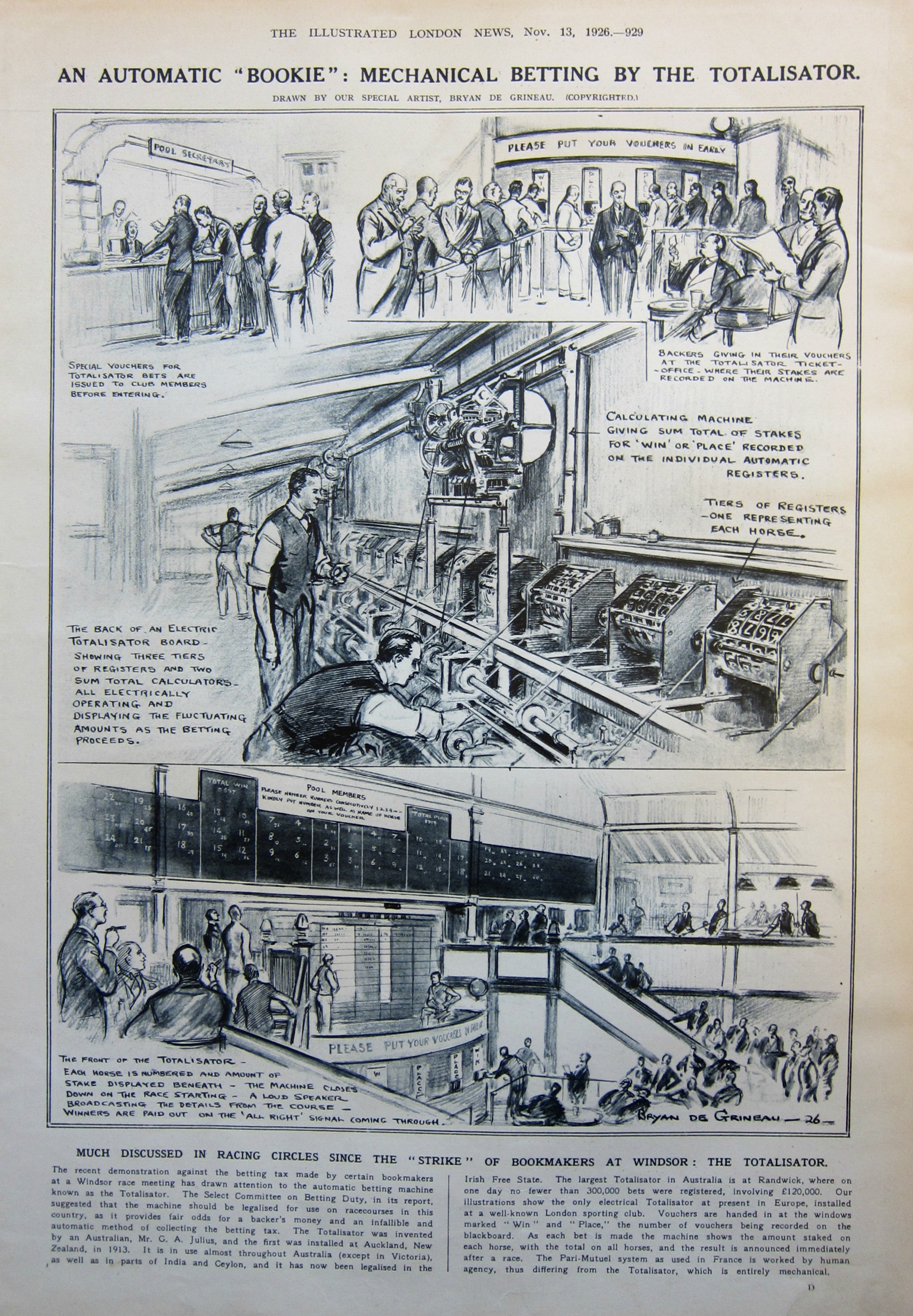 It appears as a noun in the Oxford English Dictionary as "totalizator", and goes back to a first use in 1879 in reference to the Pari(s)-Mutuel system of betting--but here, in this article, the "totalisator" is an electric betting mechanism.
