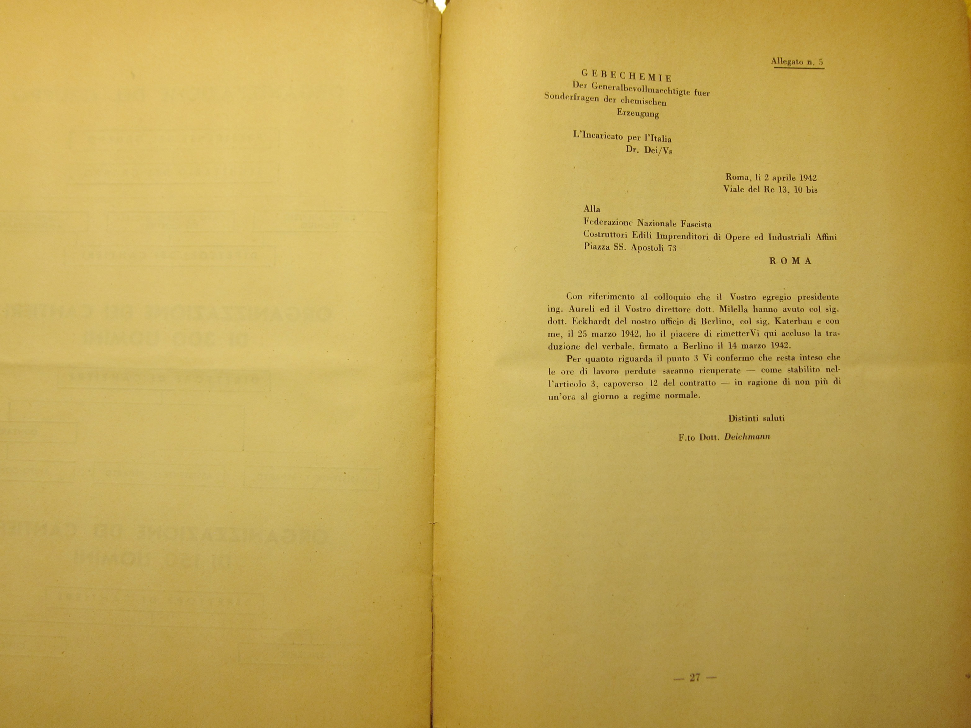 Quite apart from what was happening at these place, the Italians and the Germans were doing the complex but simple business of figuring out where to put the thousands of workers, making sure that they get paid, providing for some sort of maintenance for the workers' health, salaries, benefits, work schedules, breaks, vacations, incentives, mailing and the post, and so on. All of the bits of the most mundane things that go into a large construction projects, like building a high rise, or a tunnel, or a highway, or a bridge to hell. This contract could've been for just about anything at all. But it isn't. Its for building a part of the Auschwitz complex when anyone with any sense whatsoever knew what was already going on there.