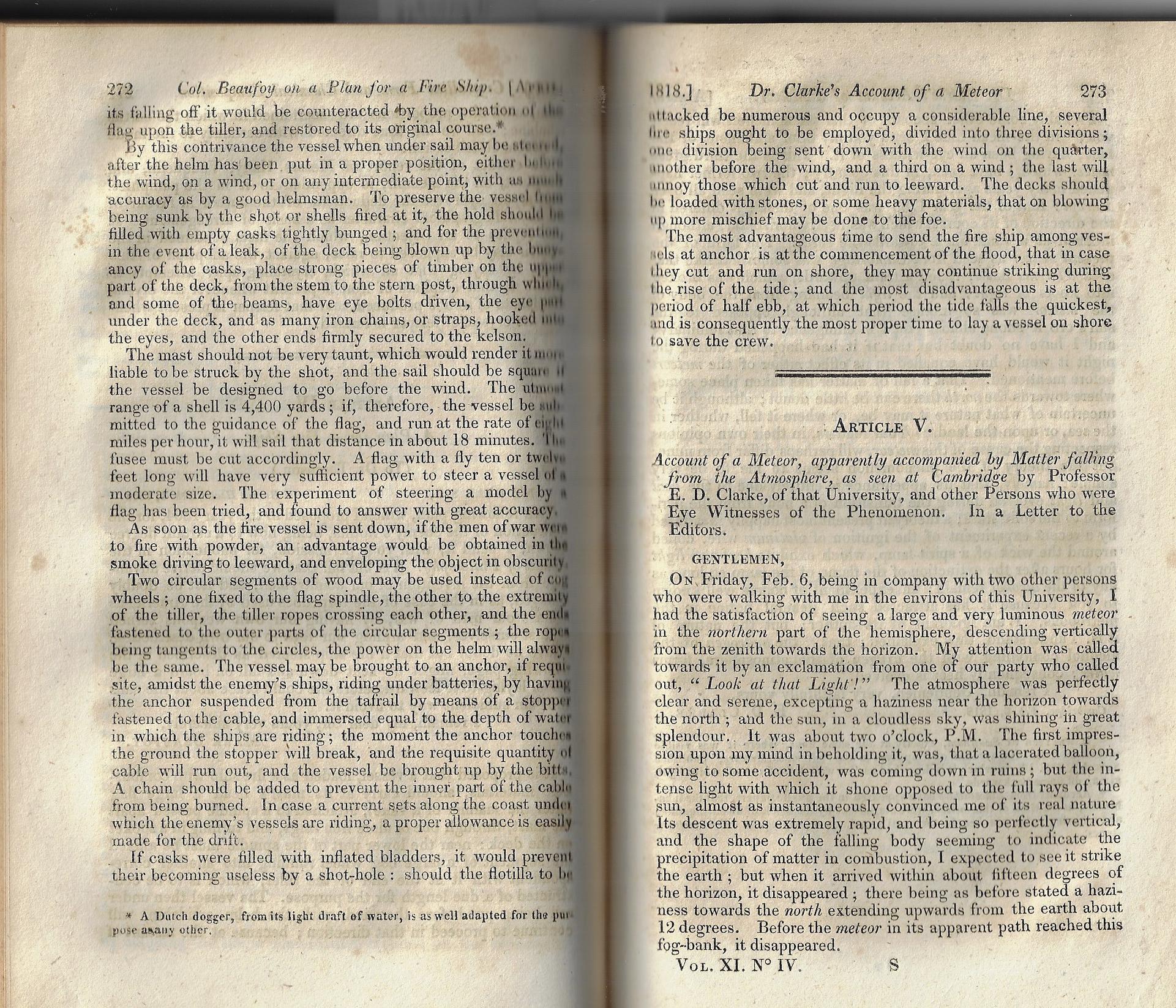 I came upon this article in The Annals of Philosophy for April 1818, suggestively entitled and not-ignorable "A Plan for a Fire Ship", by Col. Mark Beaufoy. It turns out to be a simple plan with a not-so-simple way of guiding in a ship meant take fire/explode amidst an opposing fleet/flotilla. I am far from knowing anything about naval history, so all I am doing here is reporting on this interesting article, though I have no little doubt that there is a rich history of remotely-guided bomb ships in the history of naval warfare. (The idea sounds pretty expensive to me...)
