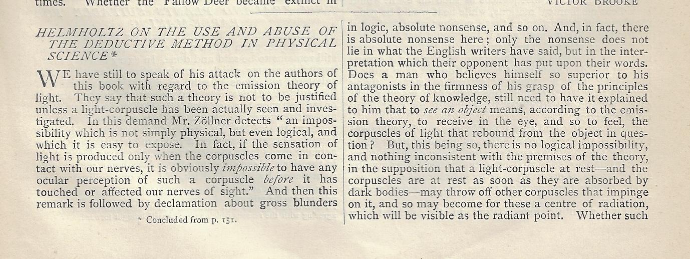 A note on a short work by Hermann von Helmholtz. "On the Use and Abuse of the Deductive Method in Physical Science", in a two-part article over two months in Nature:
