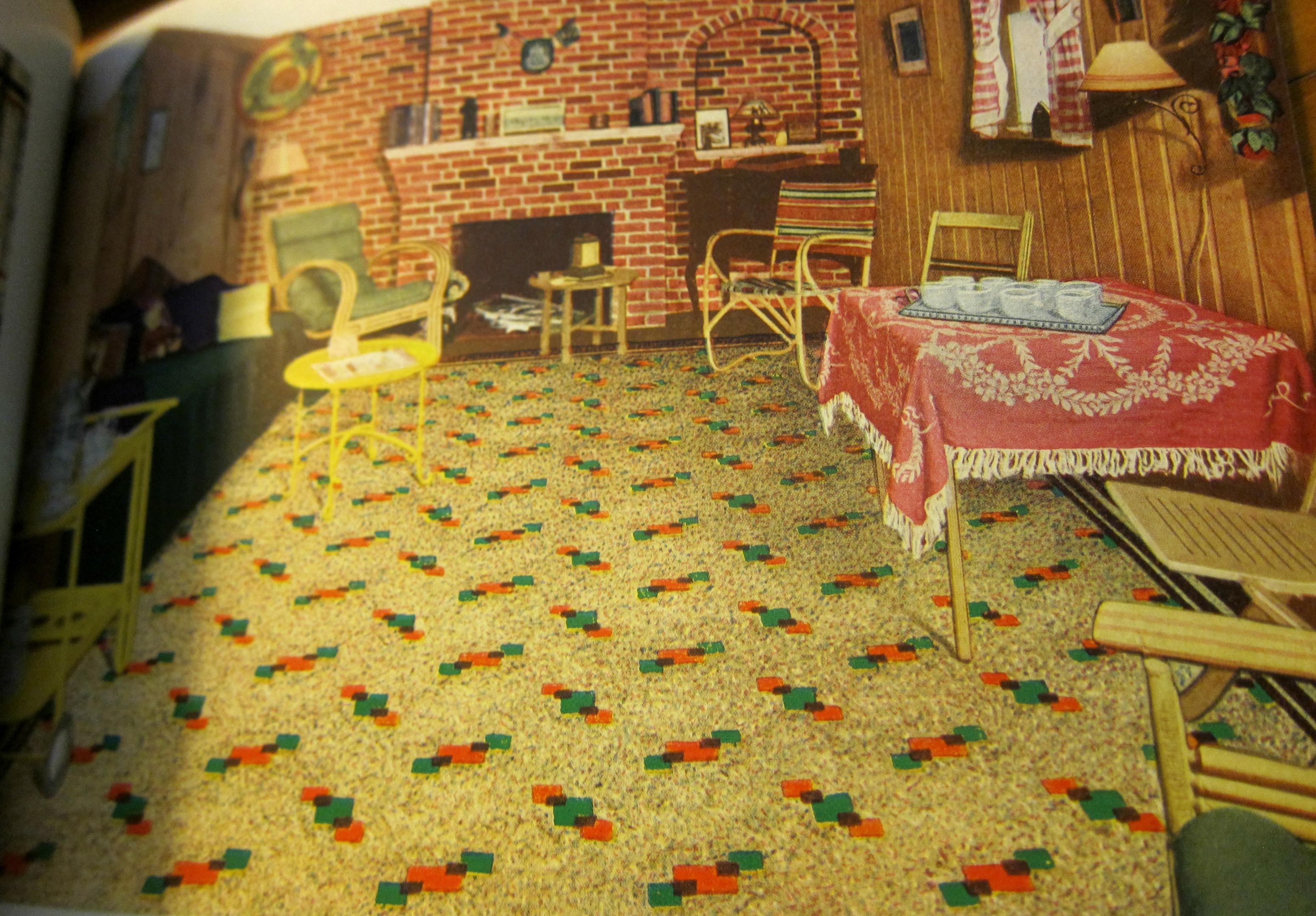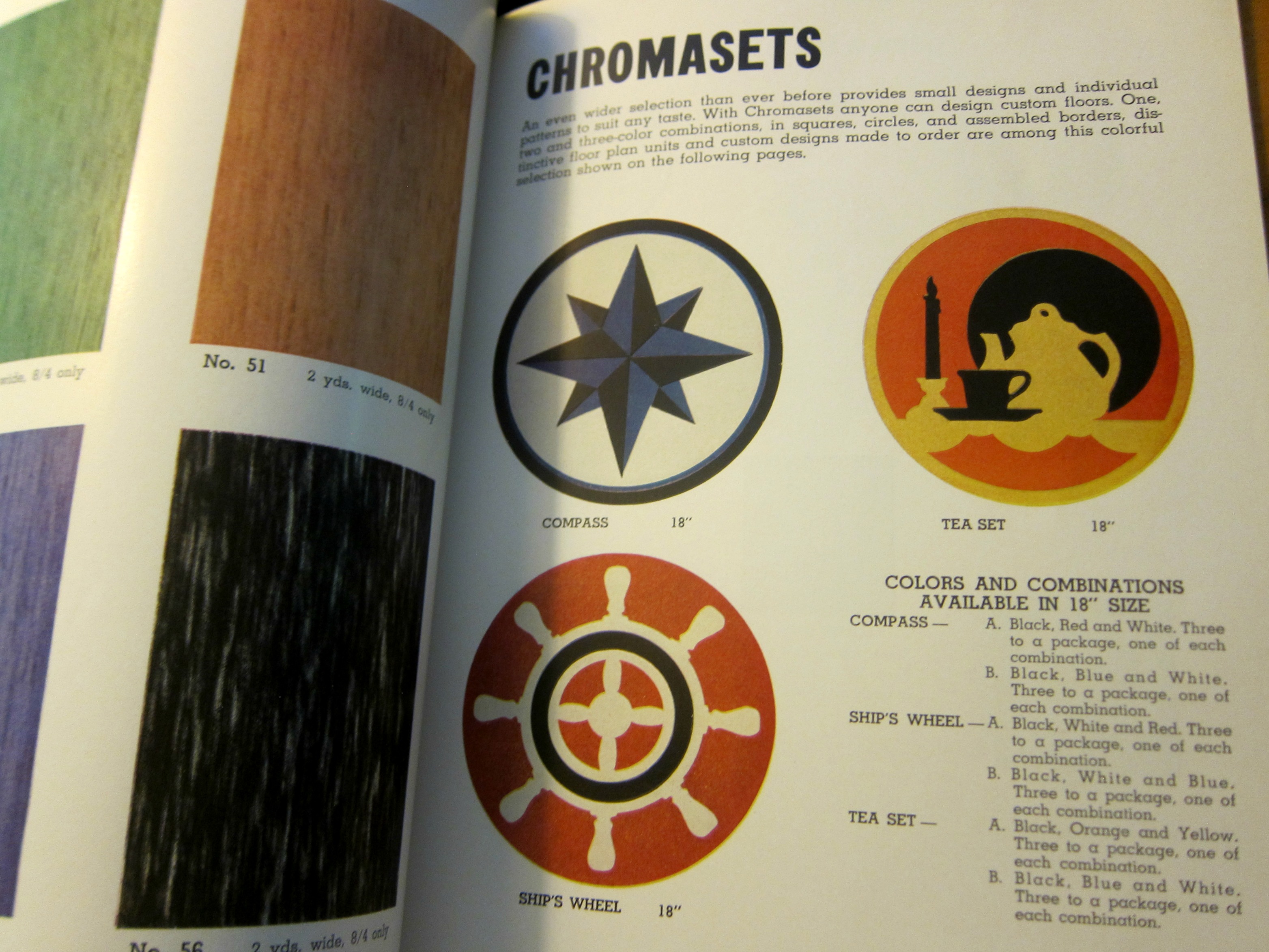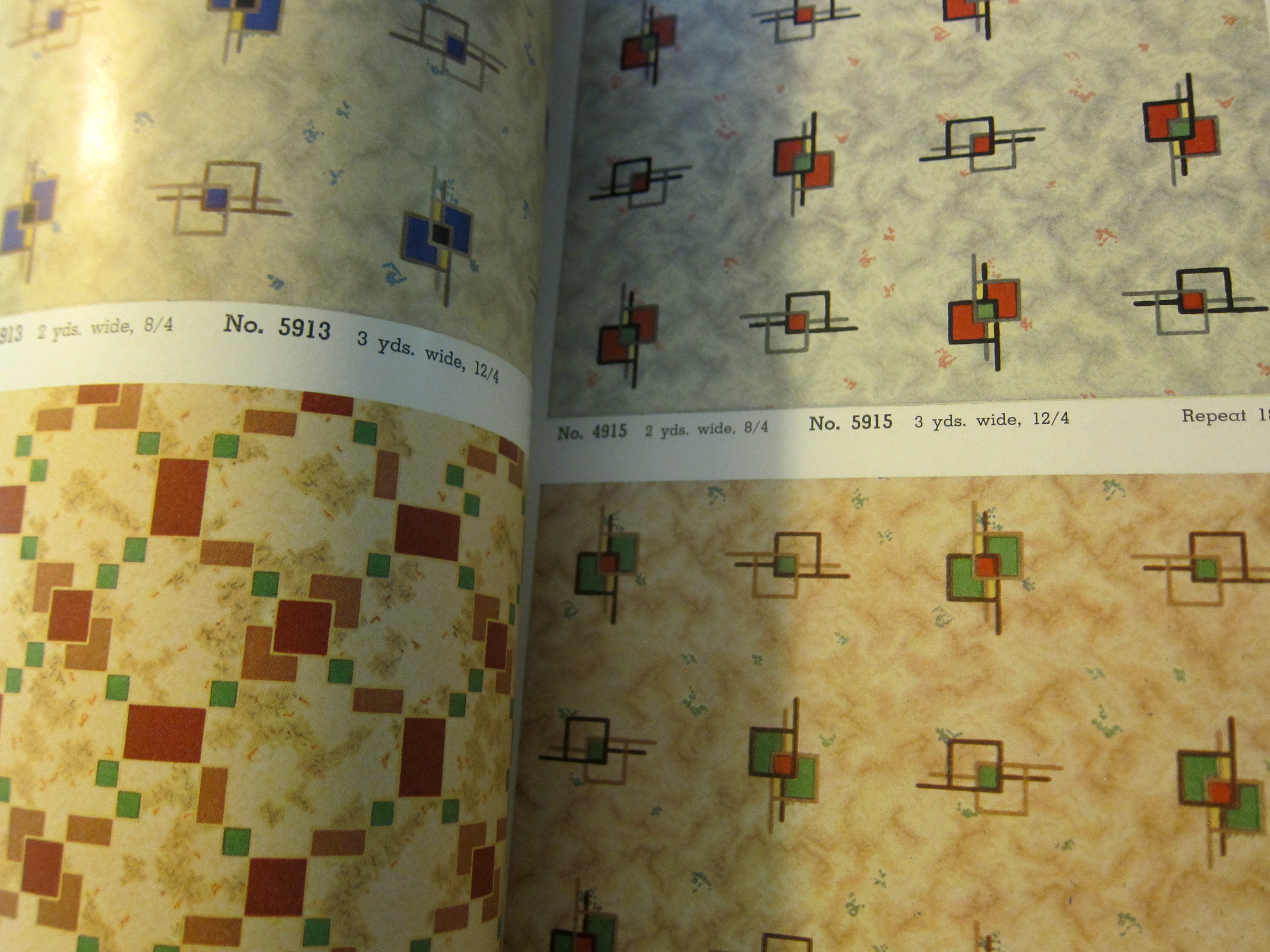 I've written a number of times on what seems to be "extreme" color in the 1930's (as in "Oddly Adjectival Opposites: Color Plumpness and Color-in-Black-and-White, 1941" http://longstreet.typepad.com/books/2011/02/odd.html) and come to it again today via the weirdly sublime color contrasts of rugs and floor coverings offered in the Bird Rug Catalog for 1938. I've thought about and seen so many of these images in luscious grays and stark blacks that it is difficult to think of these same images in gigantic color. It is just hard to picture Mr. Bogart's eyes and his accusing/weary glance being framed by that blue chair and all of the colors bombarding it. There should I guess be a diacritical of some sort to attach to the vocabulary of colors to express "surprise", as I could surely employ it in describing that blue linoleum floor: