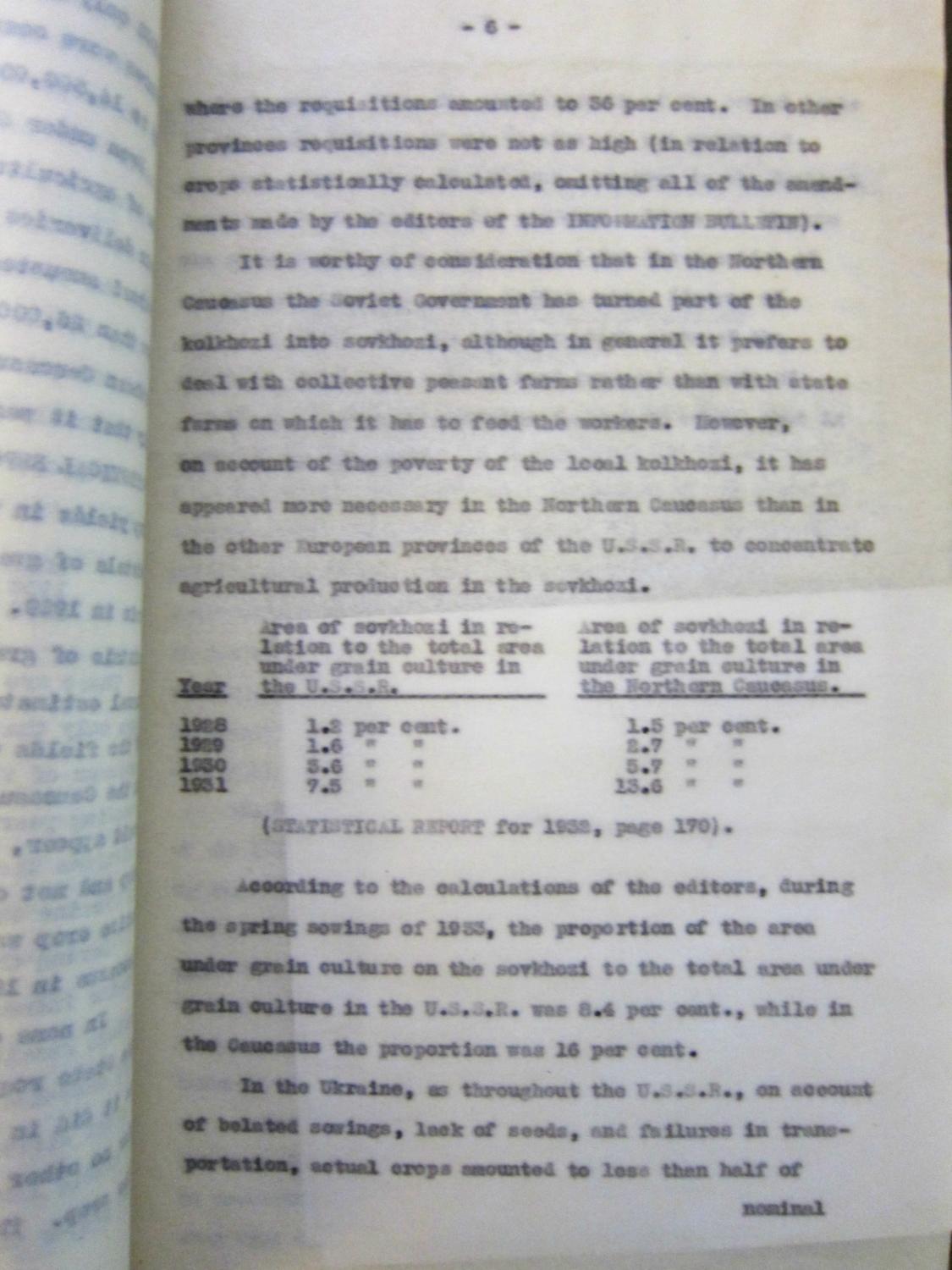 - Includes the following sections: “What proportion of the crops is confiscated by the Soviet Government?”, 9pp;“The Meaning of the Grain Tax in 1933”, 3pp;“The Increased Burden during the Last Ten Years on Soviet Agriculture”, 4pp; “The Unchangeable Economic Tendencies of the Four Years of Collectivization”, 12pp; “Soviet Methods Relative to Agricultural Statistics”, 2pp; “The Problem of the Gigantic Grain Reserves of the Soviet Government”, 4pp; “Agriculture in the Ukraine and the Northern Caucasus”, 7pp; “How Does the Soviet Village Make Up Its Grain Balance?”, 3pp; “Mobilization of the Urban Population to Assist Agriculture”, 4pp; “The State of Mechanization of Soviet Agriculture”, 8pp; “The State and the Village in the U.S.S.R.”, 11pp; “Signs of the Weakness of Soviet Agriculture”, 8pp; “Soviet Economic Diplomacy in the United States”, 9pp, “Concealed Inflation, or Deflation”, 5pp Plus 42. leaves. ”