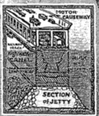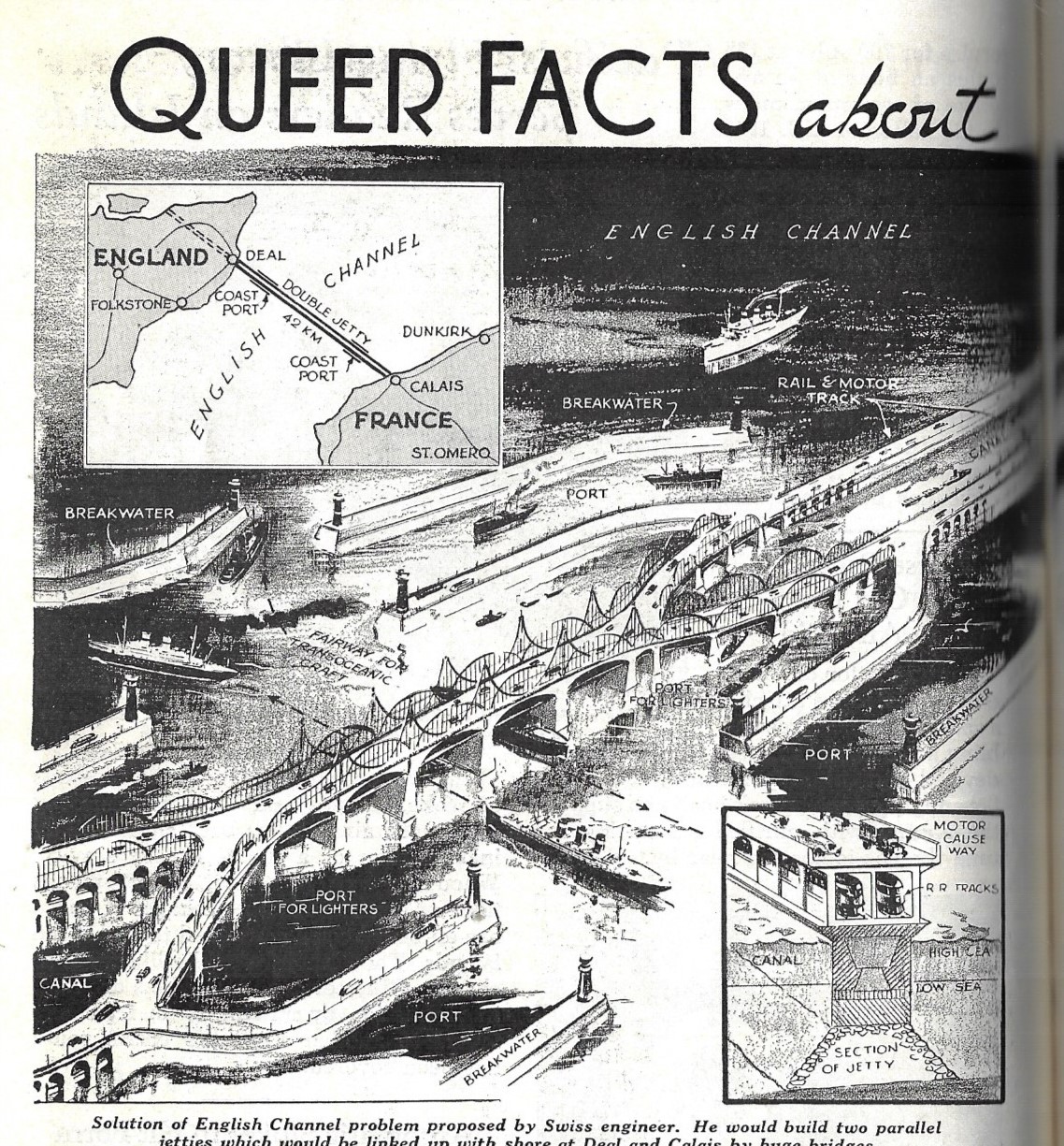 Jules Jaeger proposed this mammoth project for bridging the English Channel: a double-jetting/bridge structure with a 1000'-wide channel between the two. Claire Price wrote a story on the idea for the New York Times on December 6, 1925, and described the structure running straight as an arrow from Calais to an eventual terminus in London, and cost $400,000,000 (or between $4-10 billion in 2018 according to the BLS CPI computer). The two jetties would rise from the channel bottom and be wide enough to each hold a double set of railroad tracks and an upper roadway for cars and freight. Price states that the colossus would be able to handle all manner of traffic in the future, even though the motor causeway is two lanes wide, and that it would be safe during wartime as the jetties would protect against torpedoes for the inner canal, though there is no mention of aircraft or other sorts of attack.